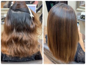 そんなお悩みを抱える女性は意外と多いんです。特に千葉・千葉駅・稲毛や津田沼周辺では湿気の影響も受けやすく、髪質改善と縮毛矯正の両方を求める方がとても増えています。今回もカラー履歴をしっかり考慮し、必要な部分だけに優しく薬剤を効かせる“ダメージレス施術”を意識しました。